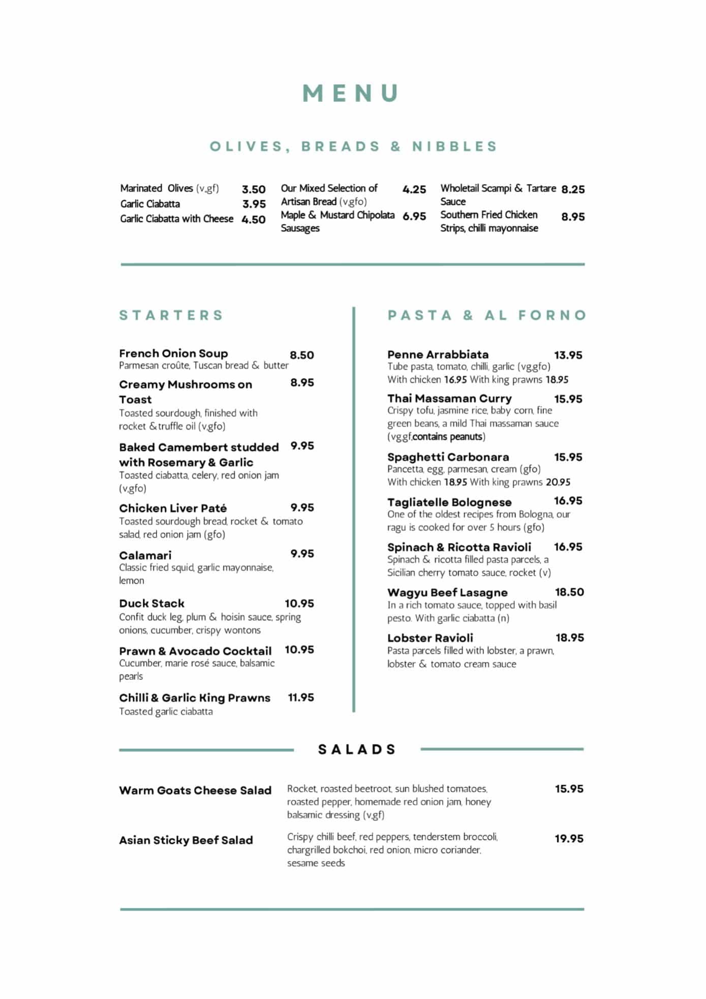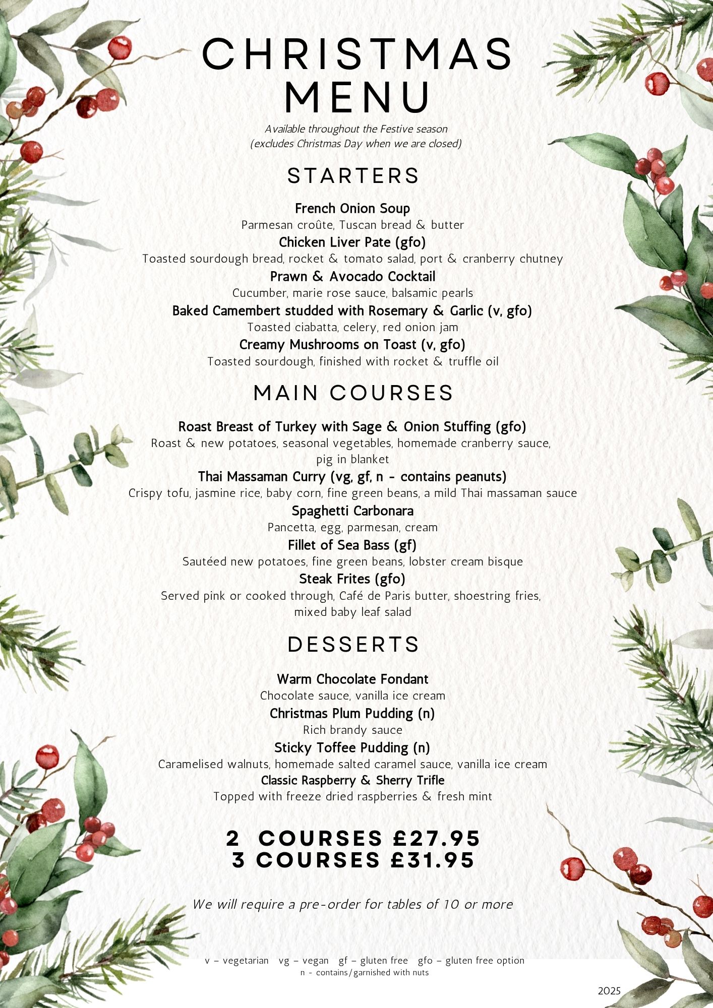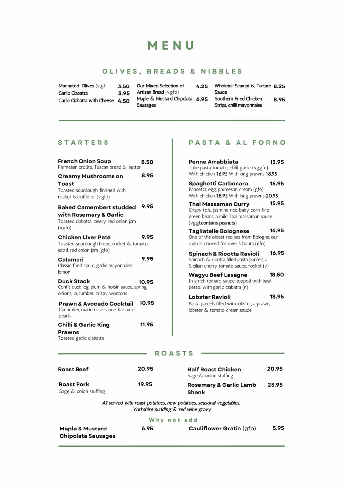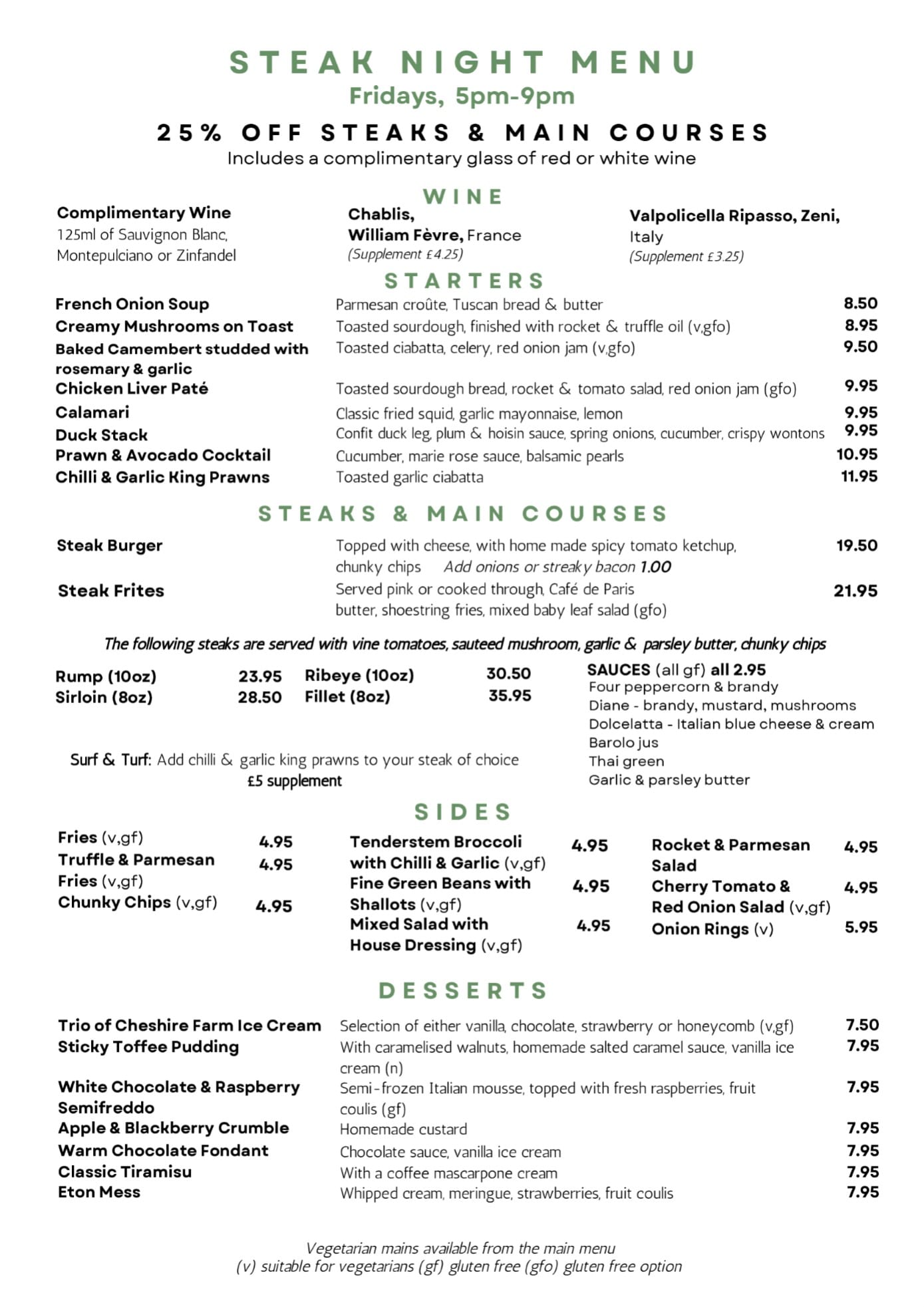 To start your meal, try our garlic ciabatta, chicken liver pate, or bruschetta. For your main course, we recommend the roast beef (Sunday only) chicken paillard, salmon teriyaki, sea bass pazanella, pasta arrabiata, or parmesan gnocchi. And for dessert, don’t miss our trio of ice cream, Eton mess, sticky toffee pudding, white chocolate & raspberry semifreddo, or coffee, tea, or espresso.