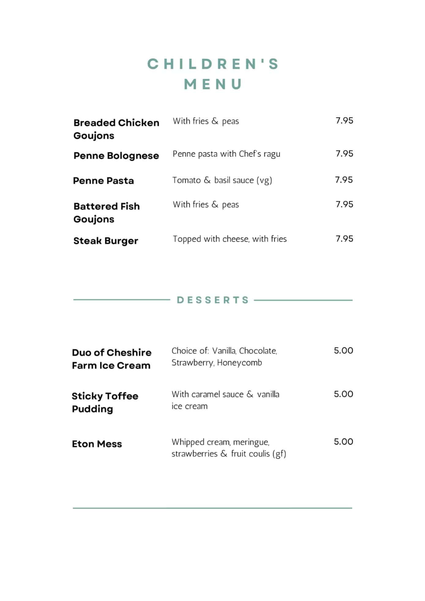 Our children's menu features a variety of classic and modern favorites, all made with fresh, high-quality ingredients. Kids can choose from breaded chicken or fish goujons with penne pasta, or a classic penne bolognese. For dessert, there's ice cream, chocolate brownie, or sticky toffee pudding.